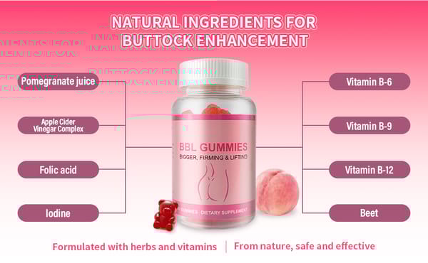 Lovovey BBL Gummies are a natural women's supplement designed specifically for hip enhancement. Each bottle contains 60 softgels infused with a delightful peach flavor, making your daily supplement routine both enjoyable and effective. Composed of carefully selected ingredients, these gummies aim to support your body’s natural curves and promote a more feminine silhouette. The blend of nutrients works harmoniously to enhance your physique while also providing essential vitamins for overall wellness. Easy to incorporate into your lifestyle, Lovovey BBL Gummies offer a delicious and convenient way to help women achieve their desired body goals naturally. Experience the confidence that comes with enhanced curves and embrace your unique beauty with Lovovey.、